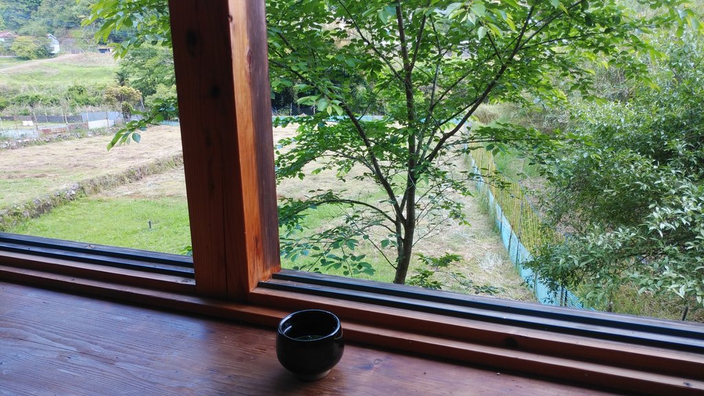 窓の外は田園風景が広がり、遠くで川が流れているようです。